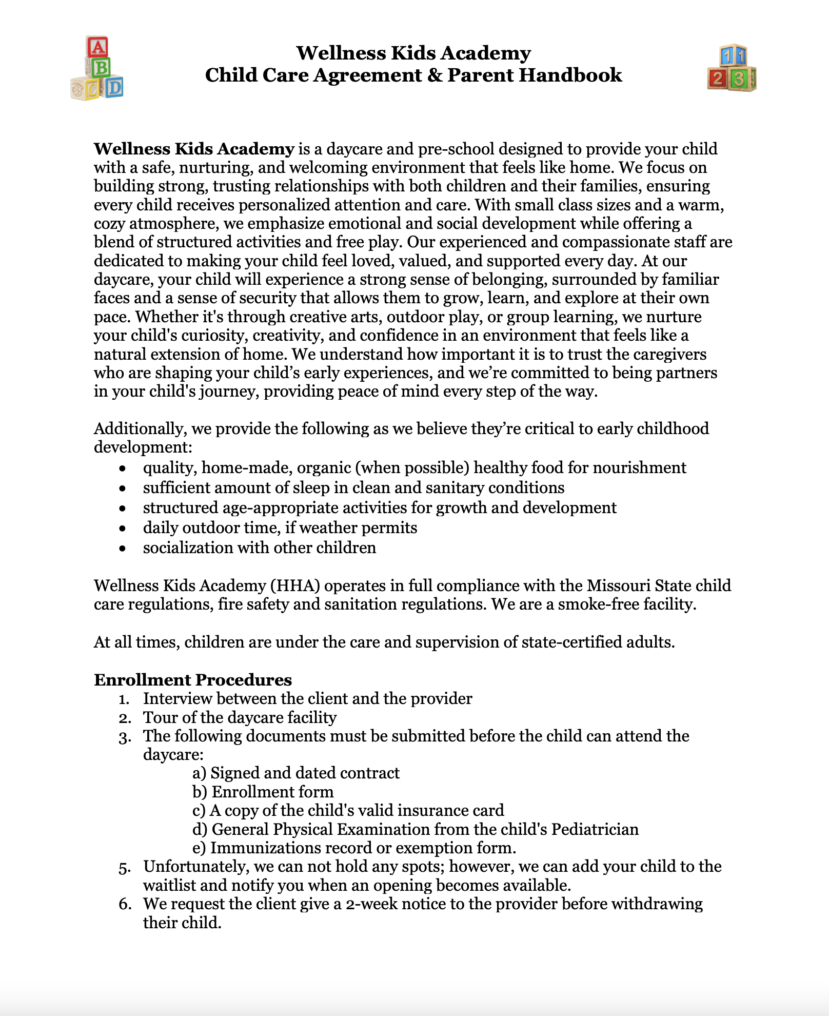 Getting Started at Wellness Kids Academy All About My Child Download Form Child Medical Exam Download Form Enrollment Form Download Brightwheel Download Share this: Click to share on X (Opens in new window) X Click to share on Facebook (Opens in new window) Facebook Like Loading...